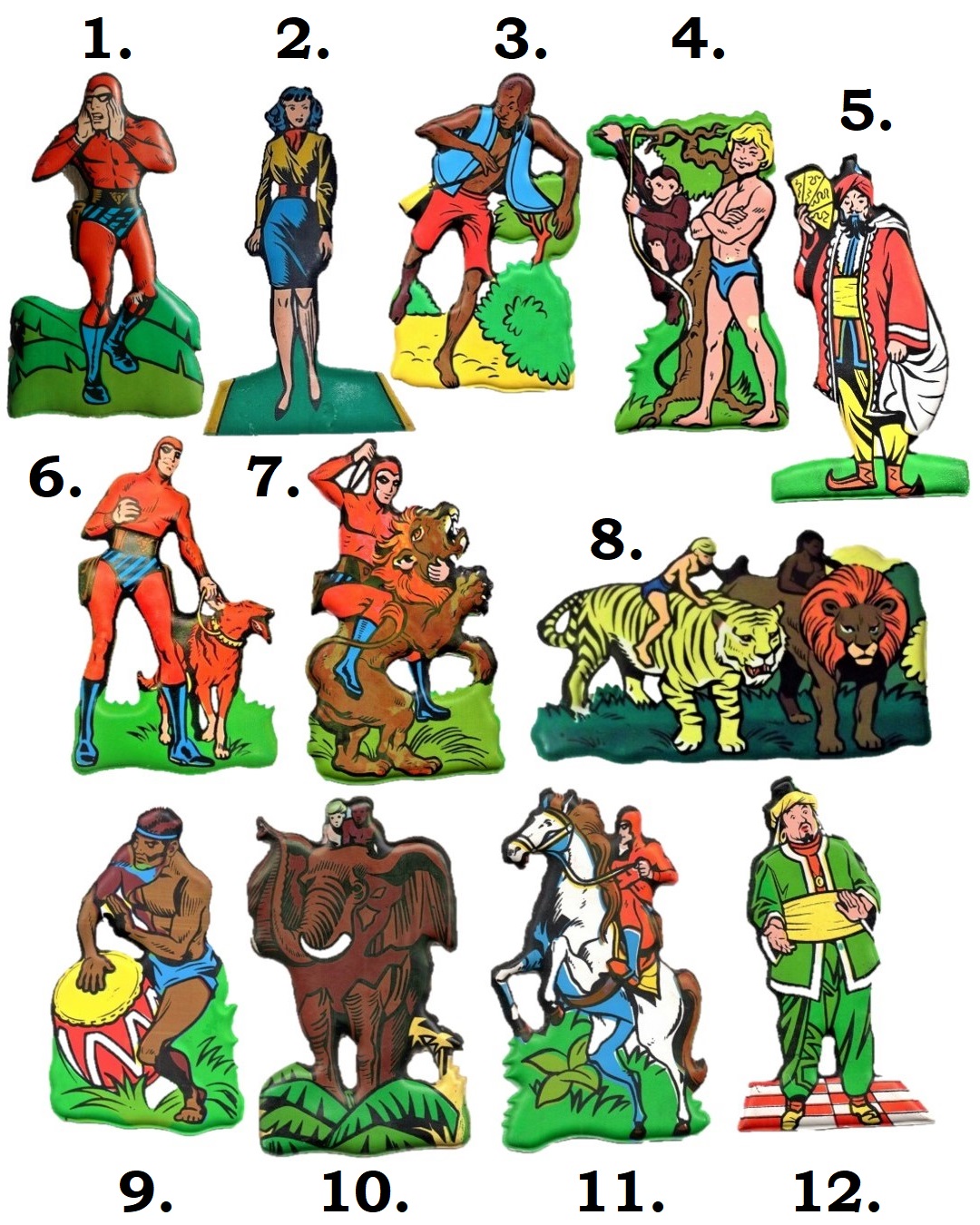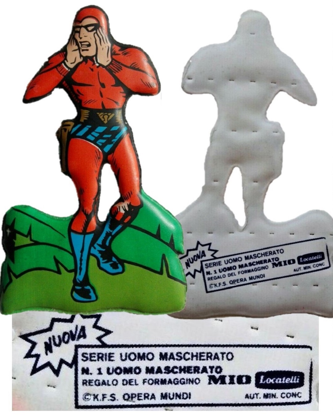 These 3” to 4” vinyl plastic stickers were printed in color on one side while the name and details of the series were printed on the back. Each of the Phantom stickers were titled ‘Serie Uomo Mascherato’ and numbered from 1 to 12. We also see the wording ‘Regalo Del Formaggino’ (translating to ‘Cheese Gift’), followed by the King Features Syndicate copyright stamp and the MIO Locatelli logo.