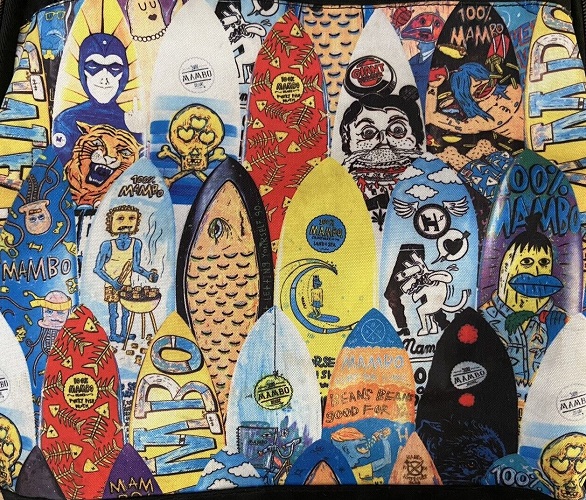 Found throughout the 100% Mambo Backpack is a print of a collection of surfboards. An illustration of the Phantom appears on one of these surfboards, as can be seen below. The same print is repeated throughout the bag, with the Phantom appearing in 4 different sections.
