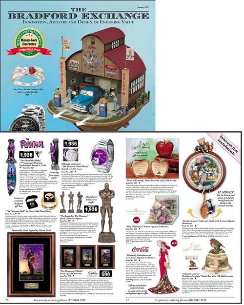 The Phantom 75th Anniversary Skull Ring was advertised in Frew Publications Phantom comic books in Australia, with advertisements appearing in issue numbers 1606, 1624 and 1660. It was also featured in The Bradford Exchange catalog’s January 2014 edition on page 26.