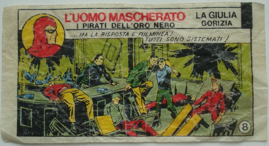 Also found within the bubble gum pack is a one-side Phantom comic stirp printed on wax-paper. Below we see the front and back of panel number 8, which would of been wrapped around bubble gum strips.