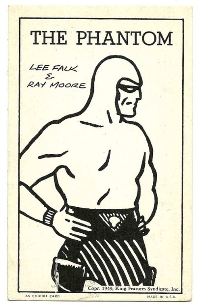 The Phantom Arcade Exhibit Card was produced by The Exhibit Supply Co. Chicago in USA in 1949. The King Features Syndicate licensed Exhibit Cards contain 32 cards in a full set, with the intention of the cards being colored in by the owner.