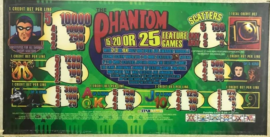 Aristocrat’s the Phantom pokie games features 25 pay-lines and has 5 reels. A 5 credit bet is the ante, making it an affordable option for players. In addition to offering up generous prizes, the Phantom offers players the chance to multiply their wins with stacked scatter and stacked wild symbols.