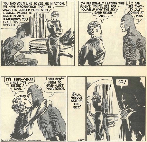 The image on the Flyer is found in the Lee Falk and Ray Moore Phantom story classic, ‘The Sky Band’, published in newspapers in 1936. The image is of ‘The Baroness’ (sometimes known under the name of June) found within the story kissing the Phantom. The comic strip panel can be seen below.