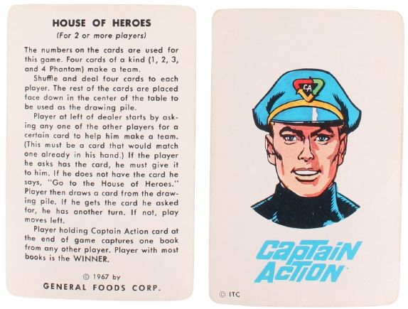 The Captain Action Card Game was produced by General Foods Corp. in the USA in 1967. The card game was a promotional give-away product with Kool-Pops, which were produced by General Foods Kitchen in the USA.