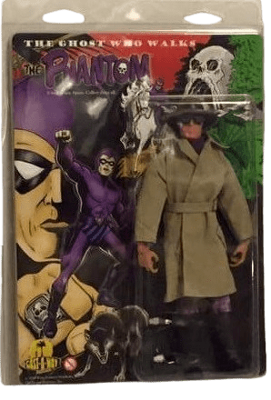 The Phantom figure was released in 2008, designed in the classic Mego style, is an 8-inch action figure featuring an impeccably tailored, deep purple fabric suit. The pack includes black plastic/rubber boots, a high-quality rubber holster with functional latches and an engraved skull buckle. The figure is equipped with two M1911 pistols and is packaged in a removable clamshell blister pack. Two punch holes are located at the top of the pack for hanging on retails stores.