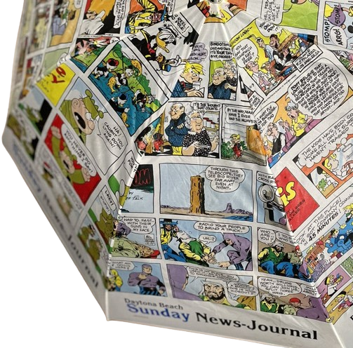 The comic strip umbrella is made of nylon fabric with color print on the upper section with a wooden handle, measuring 42” wide x 34” tall. The newspapers title ‘Daytona Beach Sunday News-Journal’ is seen along all sections of the umbrella along the lower edges.