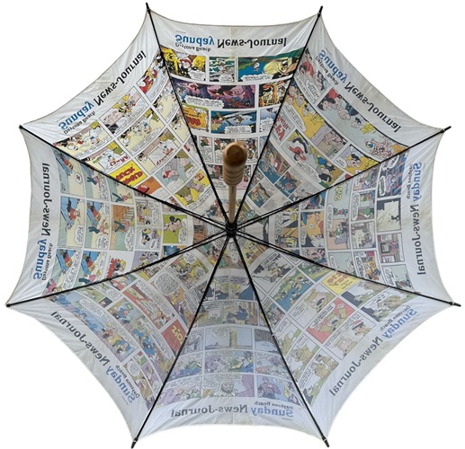 The comic strip umbrella was produced by the Daytona Beach Sunday News-Journal in the USA in 1996. Comic strip umbrella’s were produced by a variety of newspaper publications typically from the American Southwest in the mid-1990s, commonly given away complimentary with a newspaper subscription.