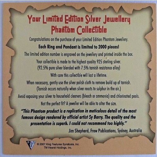 The Phantom Good Mark Ring and Skull Ring were accompanied by a certificate of authenticity, with an endorsement seen by Jim Shepherd, past Phantom comic publisher at Frew Publications in Australia.