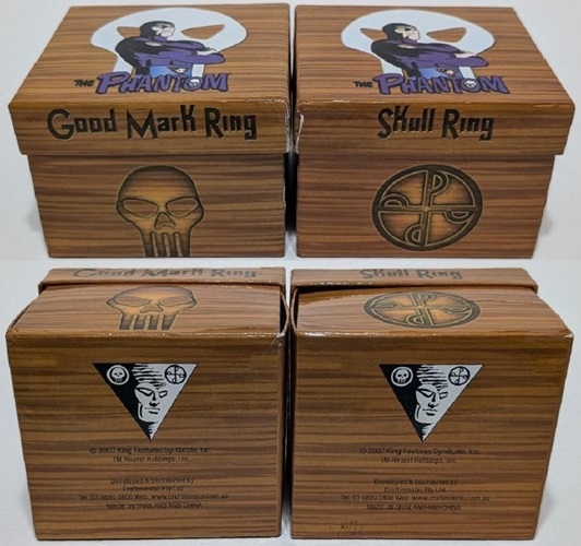 The Phantom Good Mark Ring and Skull Ring were produced by Croftminster in Australia in 2007. Limited to 2000 of each ring worldwide, and fully licensed by King Features Syndicate, the Phantom Good Mark Ring and Skull Ring are made of 925. sterling silver with a closed band. The rings are individually numbered, both on the ring itself and on the packaging.