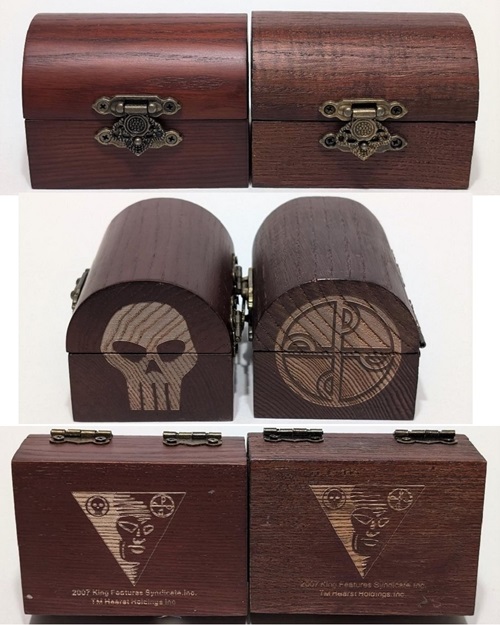 The Phantom Good Mark Ring and Skull Ring were packaged in a timber ‘chest’ style case with brass hinges and closing clasp containing intricate engravings, either the Good Mark or the Skull Mark emblem, corresponding to the ring contained within. The chest was then placed in a sturdy lithographed cardboard box which is then encased in a clear plastic shell. The cardboard box is labeled ‘Good Mark Ring’ or ‘Skull Ring’ with the respective ring symbols printed.