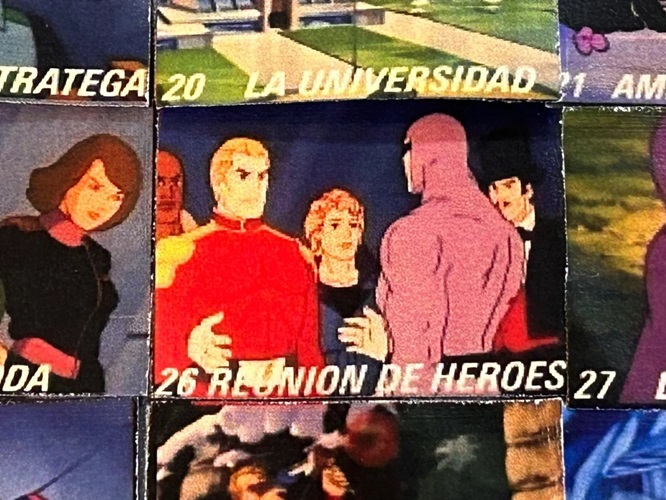 The trading card set was likely produced to be sold to children at local markets and news stands throughout Mexico, with the set not containing any copyright information. Each of the trading cards are printed on thin paper with a glossy color finish measuring 1.25” x 1.6”. The first 36 cards contain images from the Defenders of the Earth cartoon series, with the remaining 36 cards creating a large image of the main characters found in the series.