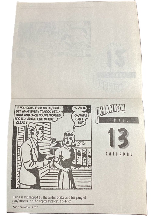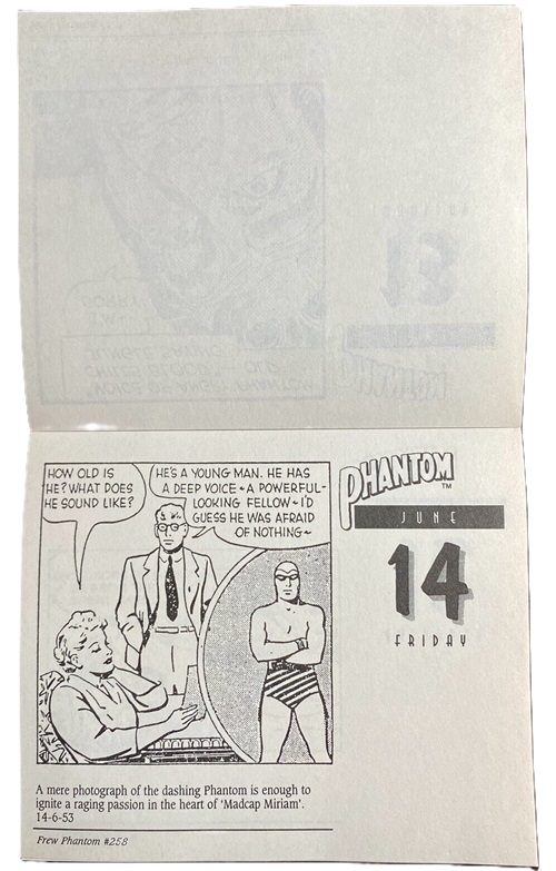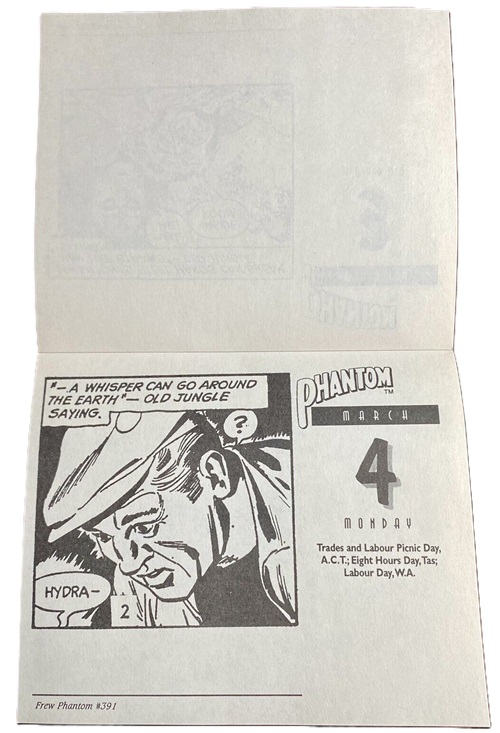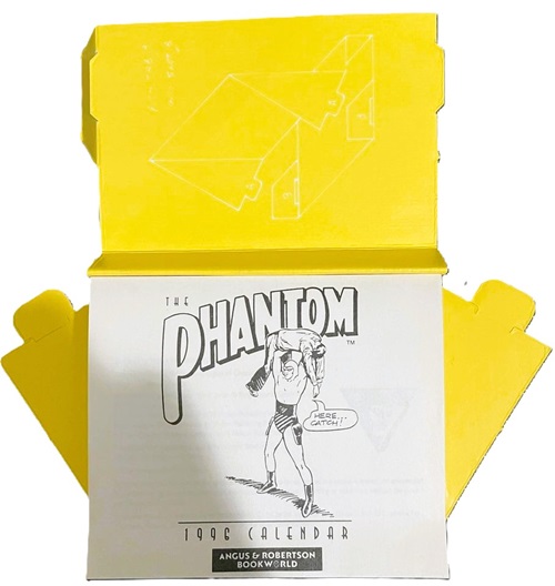 The Phantom Desktop Calendar was produced by Mallon Publishing Pty Limited in Australia in 1996. The calendar was exclusively sold throughout Australia in Angus & Robertson Bookworld book stores, a licensed item by King Features Syndicate.