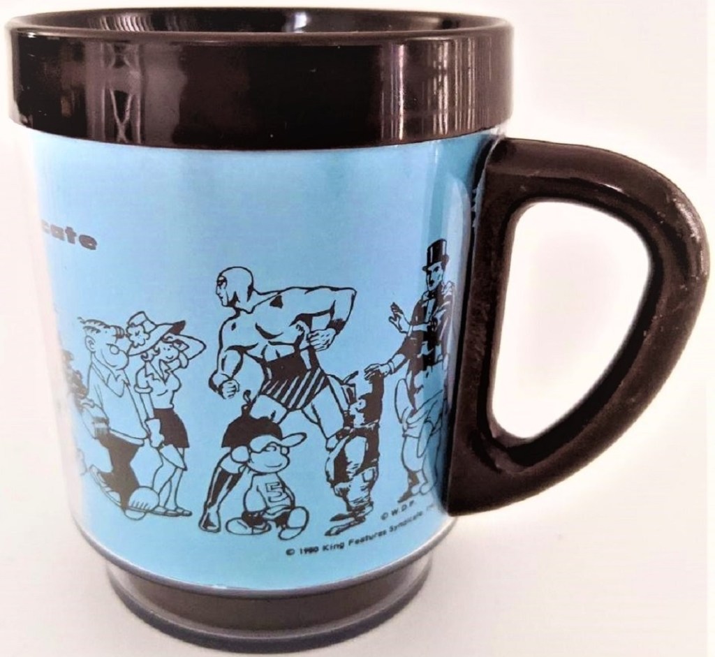 The cup’s image consist of the Phantom, Flash Gordon, Prince Valiant, Mandrake, Archie, Popeye, Snuffy Smith, Haggar the Horrible, Blondie and Dagwood, Winnie the Poo, Beetle Bailey, Hi & Lois, Red-Eye, Agatha Crumb and more.