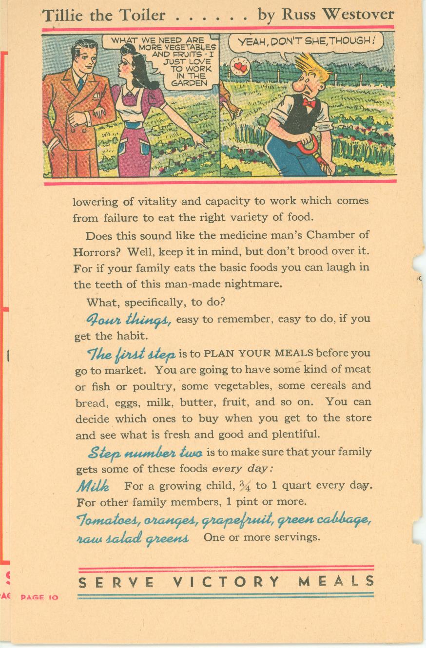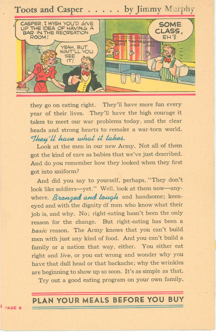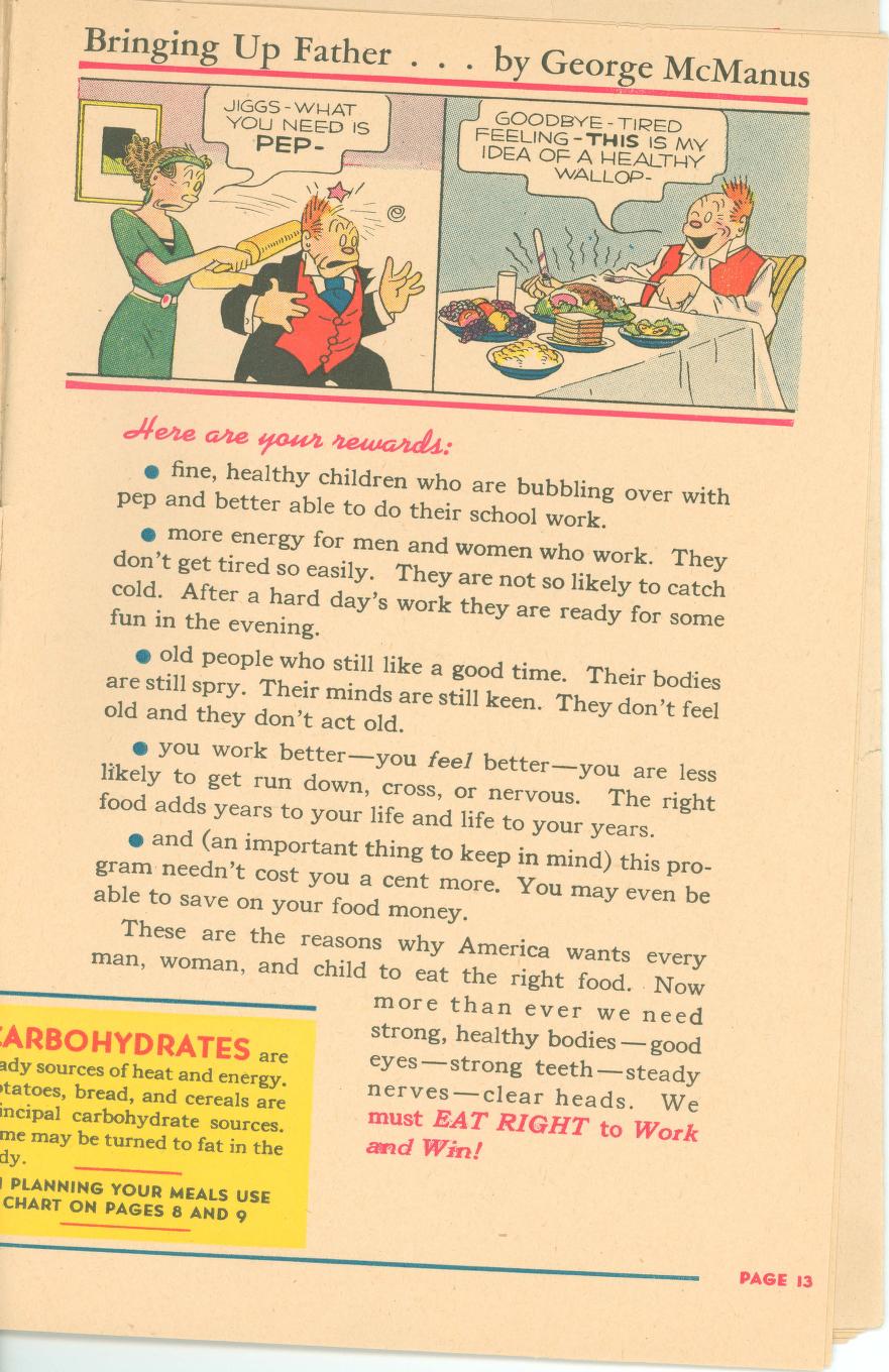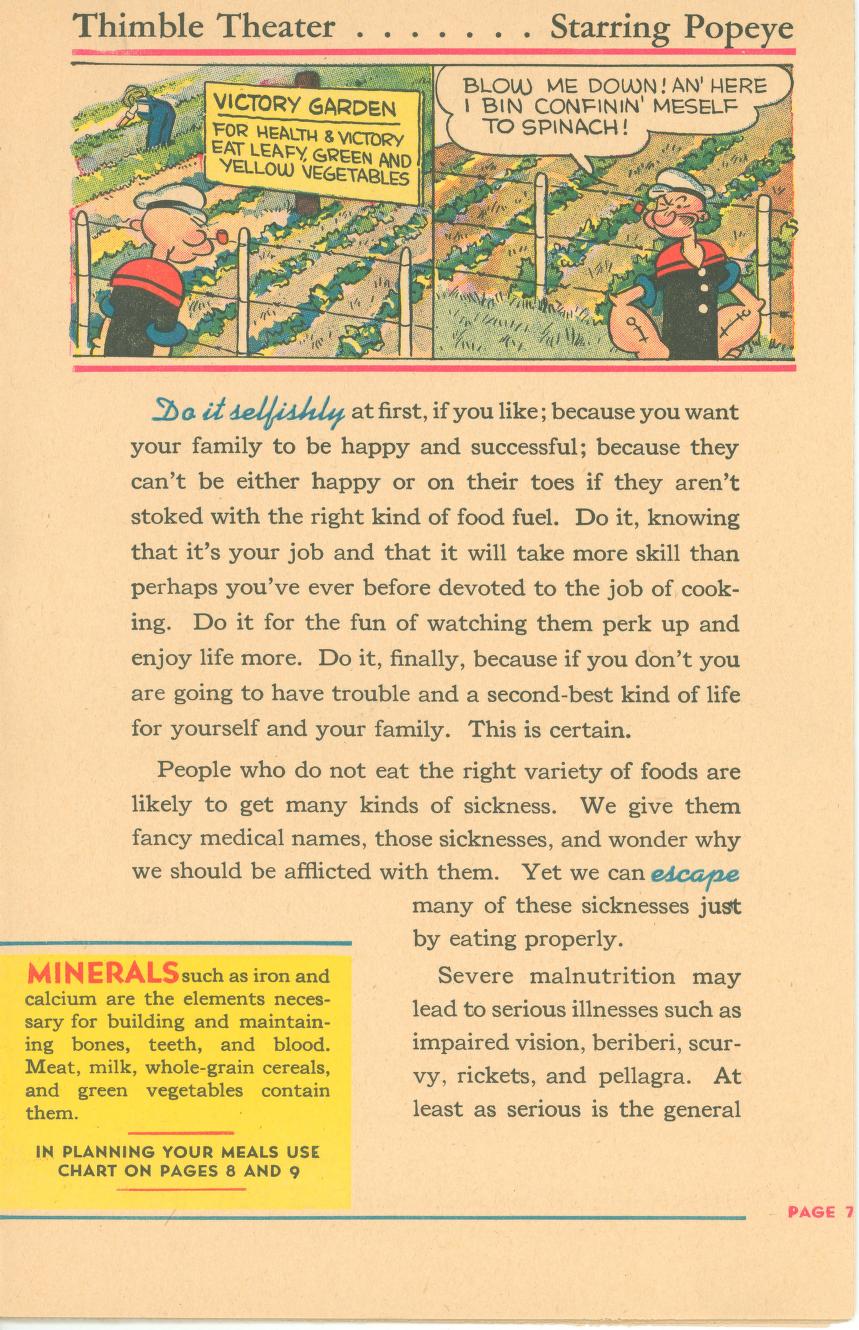 Eat Right To Work And Win was published in 1942 (during World War II) by the Office of Defense Health and Welfare Services. This booklet is a 16 page (8 1/2″ x 5 1/2″) give-away published by Swift & Company to aid America’s all-out war effort. In small print at the bottom of the front page it says: ‘Comic characters donated by King Features Syndicate’.