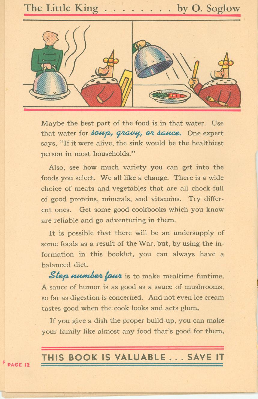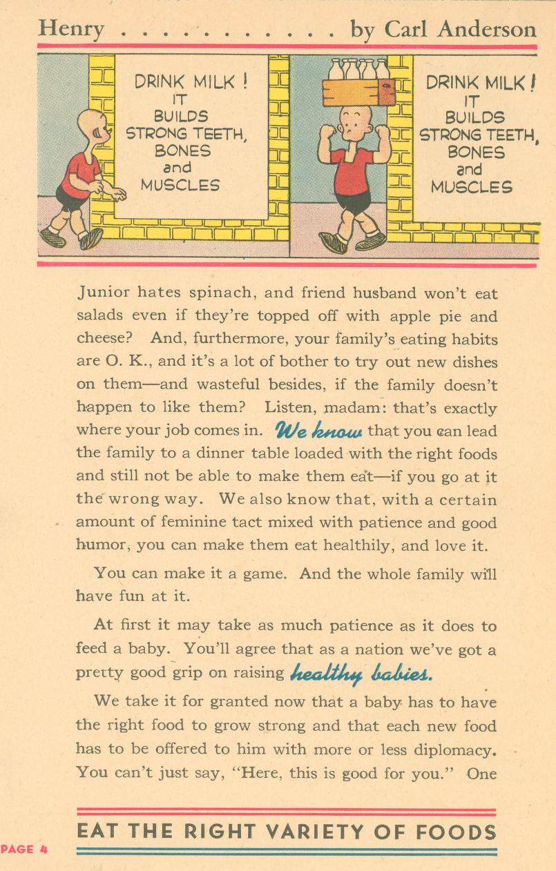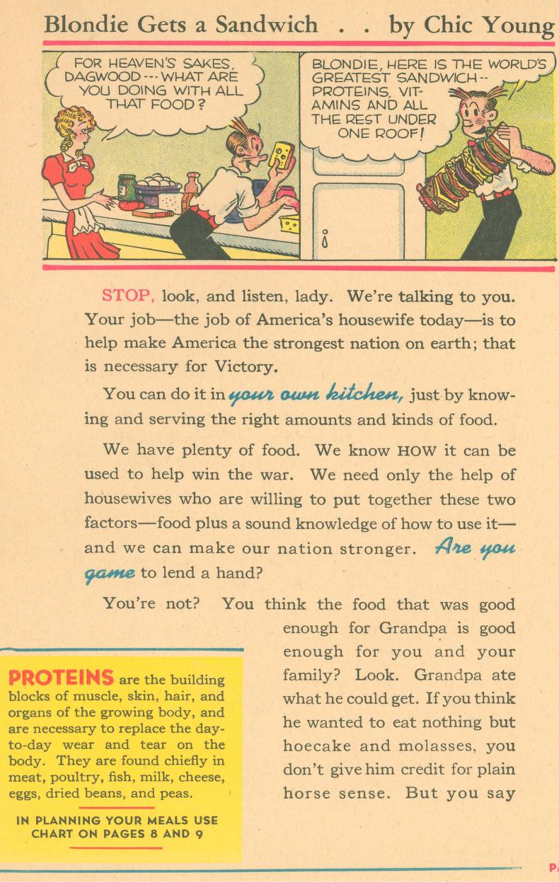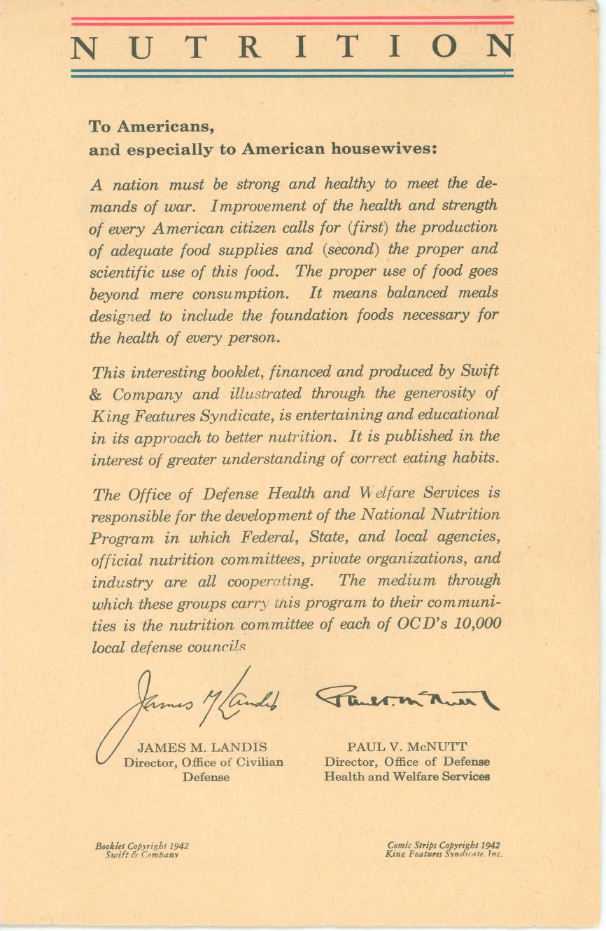 Eat Right To Work And Win was published in 1942 (during World War II) by the Office of Defense Health and Welfare Services. This booklet is a 16 page (8 1/2″ x 5 1/2″) give-away published by Swift & Company to aid America’s all-out war effort. In small print at the bottom of the front page it says: ‘Comic characters donated by King Features Syndicate’.