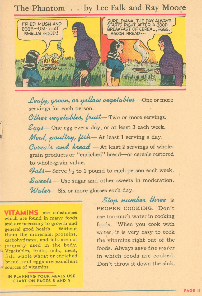 The Phantom appears in two panels at the top of page 11, he is talking with Diana and there is a smoking frying pan in the background. In the first panel Diana says: “Fried mush and eggs–um-that smells good!”. In the second panel the Phantom says: “Sure, Diana, the day always starts right, after a good breakfast of cereal, eggs, bacon, bread…”