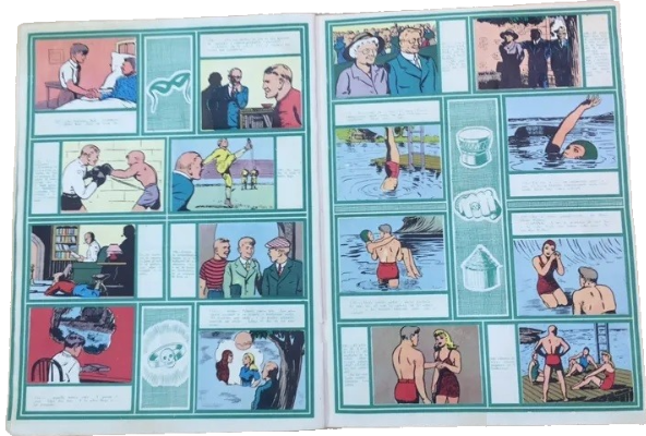 The card album was themed around the Lee Falk Phantom classic story, ‘The Childhood of The Phantom’, illustrated by Wilson McCoy, published in Sunday newspapers in 1944. A full set of cards is made up of 203, with a 32 page album released to attach the 203 paper cards. The front and back covers of the album can be seen below.
