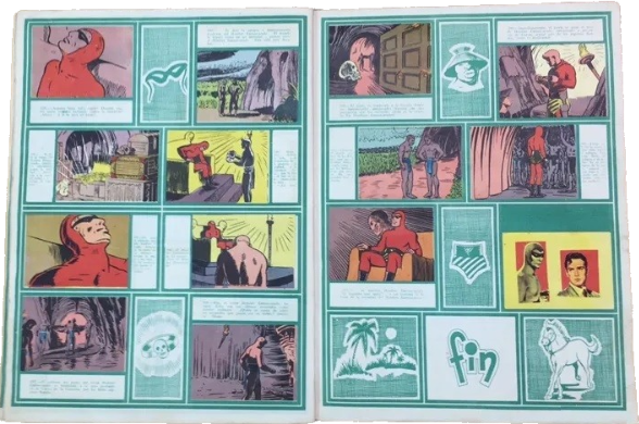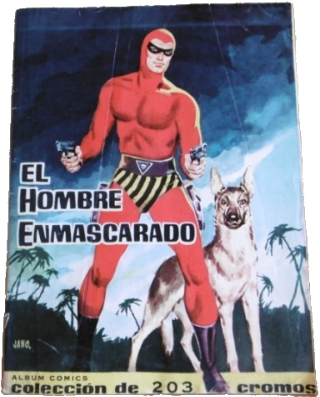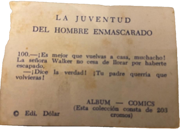 El Hombre Enmascarado Coleccion de 203 Cromos (translates from Spanish to ‘The Phantom – Collection of 203 Stickers’) Sticker Card Album was produced by Editorial Dolar in Madrid, Spain in 1961. The album is titled ‘La Juventud del Hombre Enmascarado’, which translates to ‘The Youth of the Phantom’.