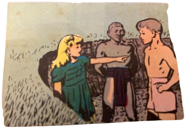 The 203 cards are unnumbered at the front with a few cards normally required to form an image within the allocated section of the album, which are glued down by the owner. Below we see card number 100. The rear of the card contains the card number which matches to the allocated section within the album, plus a short description of the Phantom story line that the image represents, leading to all 203 cards containing unique text.