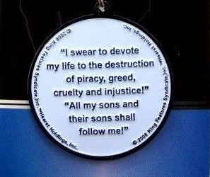 The Phantom Keyring is produced in full color with a gloss enamel finish. We see the wording ‘The Phantom – The Ghost Who Walks’ on the front. On the back of the keyring, we find copyright information plus the year of production. The Phantoms oath is also found on the back, reading “I swear to devote my life to the destruction of piracy, greed, cruelty and injustice!”, “All my sons and their sons shall follow me!”.