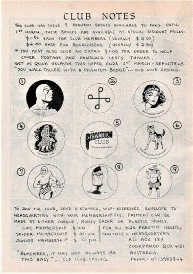 The Fan Club Badges were produced by ‘The Phantom Club’ of Australia. 2 sets of badges were advertised, one in 1983 and a second set in 1985. A total of 9 designs were released over these 2 sets, with 6 designs repeating within the 2 sets. The badges were advertised by the club as both text and illustrations on the back cover of Frew Publications Phantom comics, plus via the clubs various order forms and product catalogs. Each badge measures 2.25”.