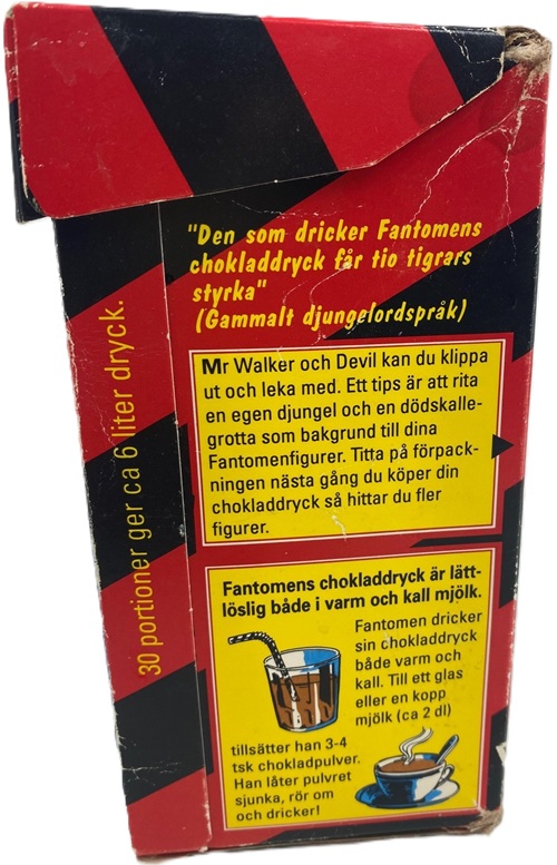 Fantomen Chokladdryck was sold in retail stores across Sweden in a cardboard box which open from the top holding 400g of powdered drinking chocolate, measuring 15cm height and 9.5cm wide. Colors found on the packaging are in keeping with those found in Fantomen comics in Sweden, with the Phantom and Devil featured on the front of the box. All four sides of the box can be seen below.