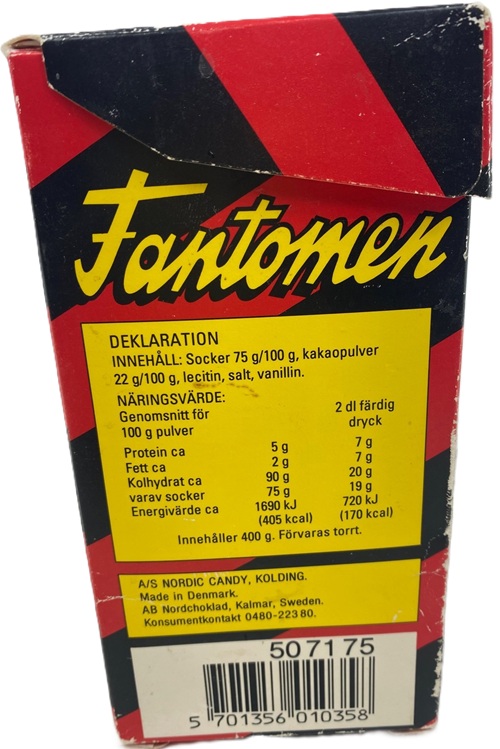 Fantomen Chokladdryck (which translates to The Phantom Chocolate Drink) was produced by Nordic Candy A/S in Kolding, Denmark in 1991. Although produced in Denmark, it was sold in retails stores throughout Sweden by Nordchoklad AB located at Kalmar, Sweden. The Chocolate Drink came in the form of powdered drinking chocolate, which when mixed with milk or water, produced a chocolate flavored beverage, with 30 servings found per box making approximately 6 liters of drink.