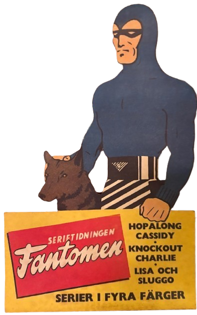 The Fantomen Comic Book Display Sign was produced by Serieförlaget (which later became Semic Press) in Sweden in the 1950s. The shop display (or skyltställ) was produced to promote Fantomen comic books in retail outlets throughout Sweden, a comic book series which has been in print since October 1950.