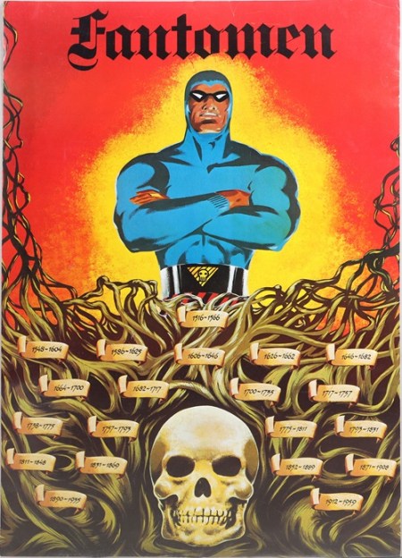 The Fantomen Family Tree poster measures 64cm x 95cm, printed in full color and illustrated by Jaime Vallvé. The poster depicts the Phantom with crossed arms under the heading ‘Fantomen’. The lower part of the poster contains a skull surrounded by a vine with the years of each of the 21 Phantom generations severed as the Phantom.