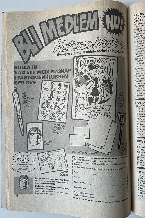 Fantomen Klubben (which translates to Phantom Club) was established by publisher Serieförlaget with the release of Fantomen comic book number 1 in 1950. The club offered a variety of Phantom collectibles as part of becoming a member, including stickers, badges, pens, stationary, key rings, membership cards, membership certificates and more. The design of these collectibles changed over time.