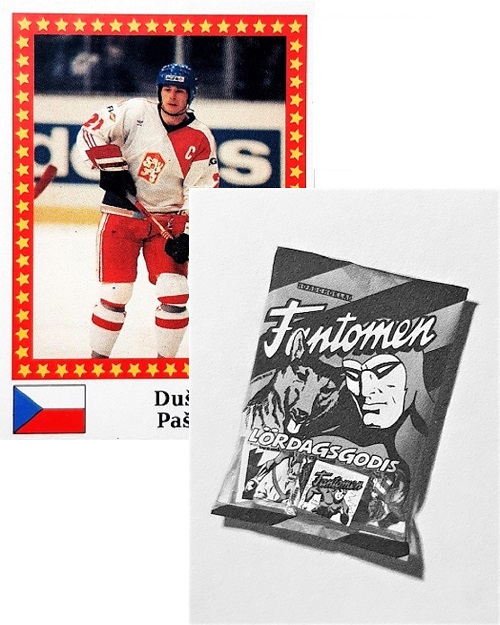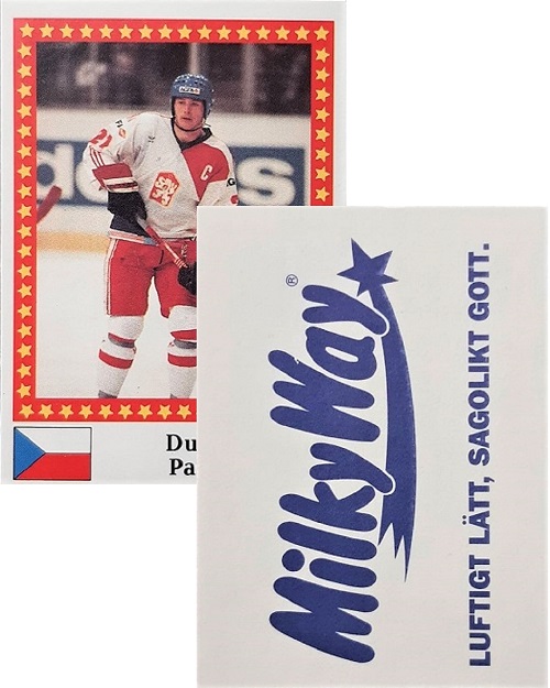During the early 1990’s it was quite common for brand name foods to advertise their products on the reverse sides of collectible sports stickers. Such brand names included Marabou Chocolates, Milky Way, and even Fantomen Lördagsgodis candies.