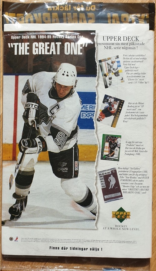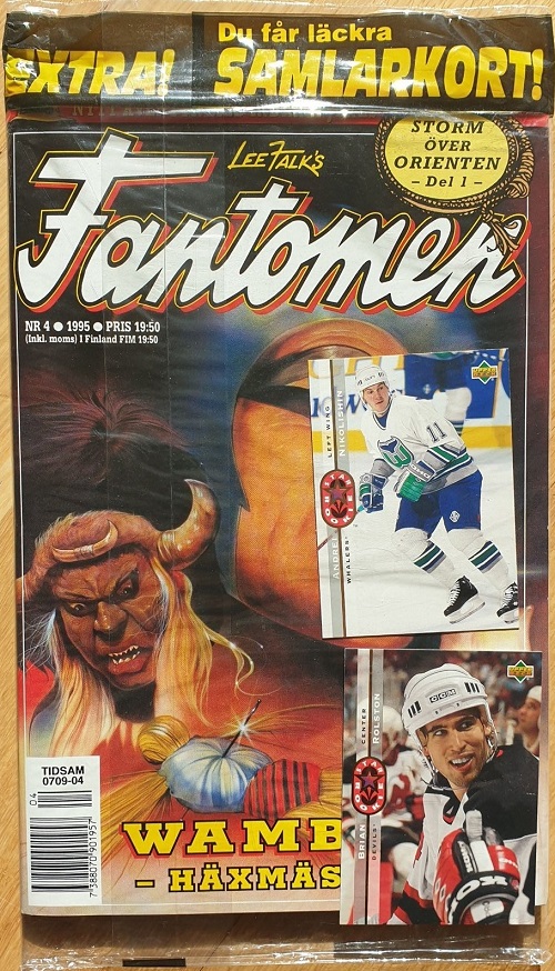 Hockey cards were also given away with Fantomen comic books. Below we see 2 Upper Deck National Hockey League trading cards with Fantomen comic book number 4, 1995.