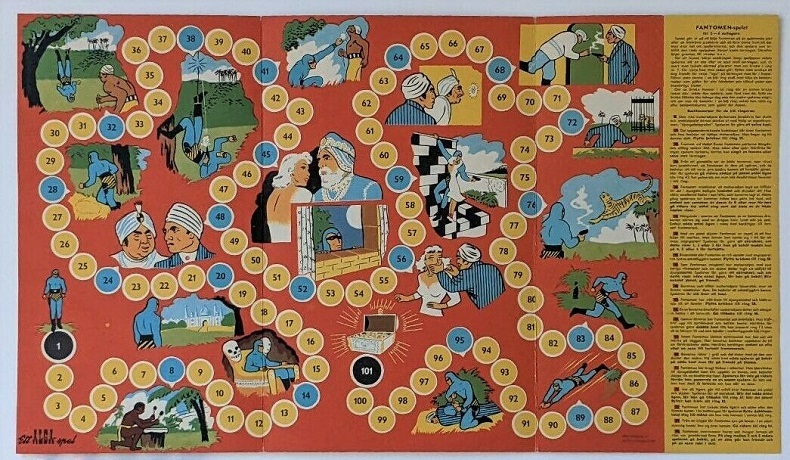 The illustrated board game displays images found in Fantomen comic strips. The game is a step-by-step race to reach a treasure chest, moving markers across the board on the designated numbered tiles (101 in total). Based on the number spun on a provided dice, is the amount of moves a player makes.