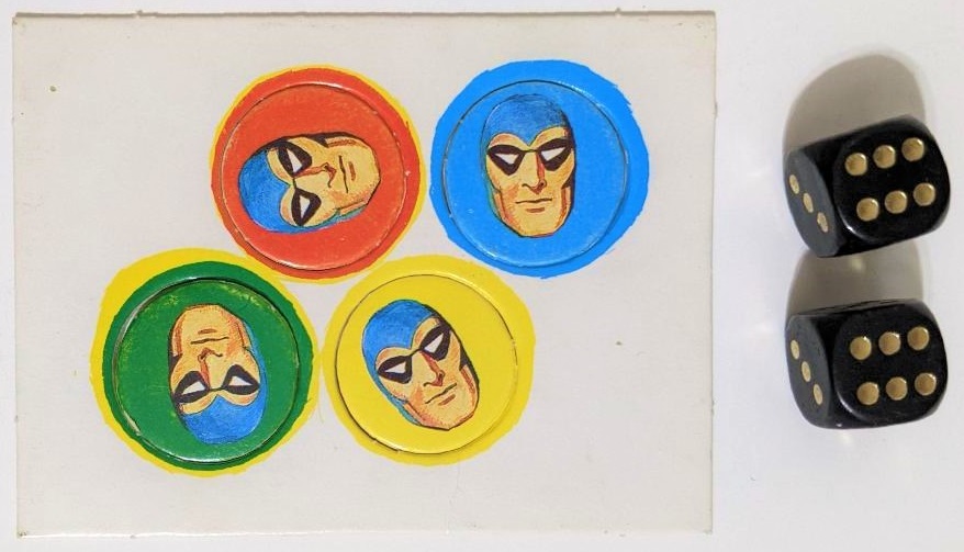 The President is freed by a single Phantom player and the remaining players automatically become ‘bandits’ by turning over the die cut pieces to reveal a bandit character. Each bandit character now tries to reclaim the President by fighting the Phantom. The Phantom is fought by rolling two dice. The outcome of this new battle between The Phantom and bandit is determined by the value of the players roll. If the Phantom is defeated the bandit who won the battle now becomes the new Phantom and the old Phantom is now turned to bandit. The ‘new’ Phantom now races to either the Skull Cave or Morristown to end the game.