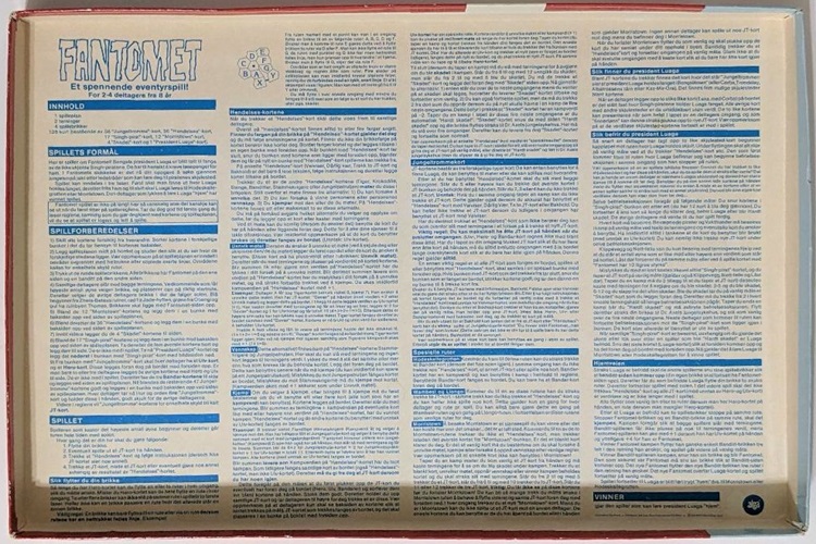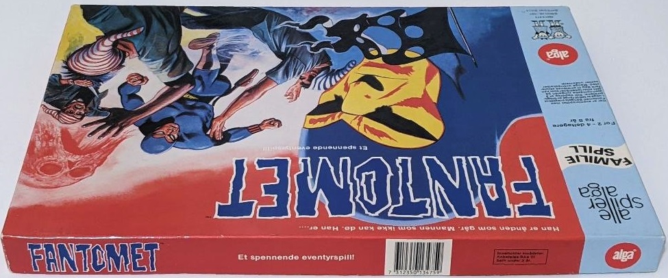The Phantom/Fantomen Board game was so popular that a mere two months later, Alga introduced the same game to three additional Northern European countries: Norway/Fantomet, Denmark/Fantomet (variation lettering) and Finland/Musta Naamio.