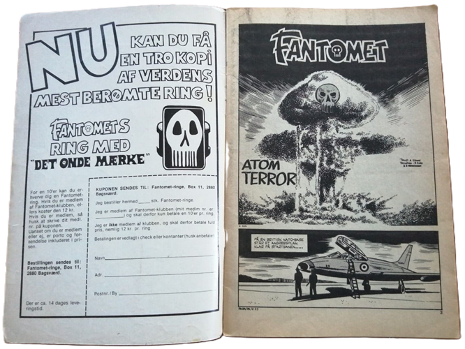 On the inside front cover, we see a black and white advertisement for a Phantom skull ring. The comic book reader was required to send payment with the provided coupon to an address in Bagsværd, Denmark. A discount was proved to Fantomet Klubben (Phantom Club) members, with the membership number required to be noted on the coupon.
