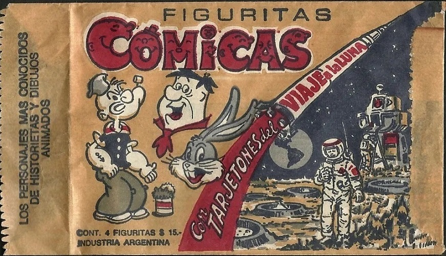 The Figuritas Comicas trading cards were sold in paper packets, containing 4 randomly placed cards per pack. An example of the front and back of the packet can be seen below.