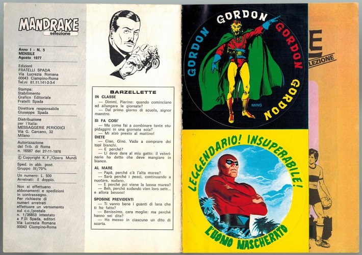 The Phantom stickers were produced by Fratelli Spada in Italy and France in 1977 and 1982. The stickers are found in select comic books as free give-way inclusions across a number of comic books featuring the Phantom, Mandrake the Magician and Flash Gordon. The stickers are found on a sheet inside the front cover, before the commencement of the first page, glued into the binding.