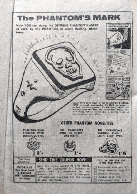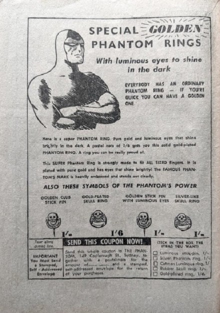 7 items of Phantom merchandise were released between 1950 and 1969, with advertisements seen both within and on the outside of comics published by Frew Publications. At least 21 varying advertisements have been identified over this 19 year period.