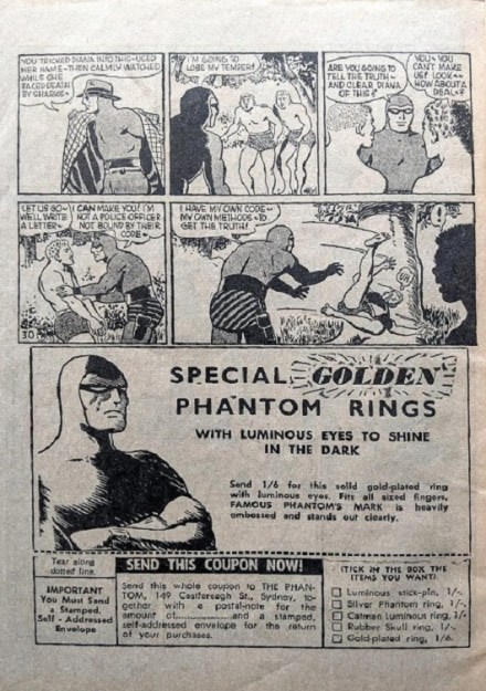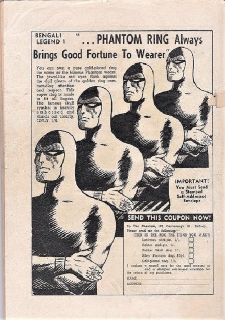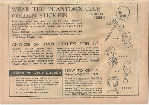 As the Phantom grew in popularity in Australia in the late 1940’s, we start to see Phantom merchandise become available to the public. Frew Publications actively offered Phantom merchandise across it’s range of comic books and we start to see advertising alongside Phantom comic strips.
