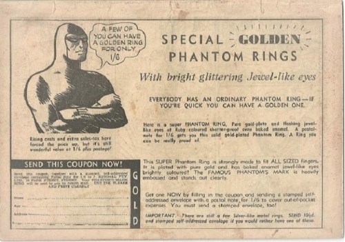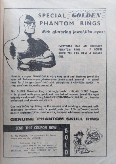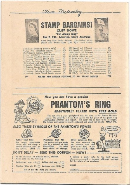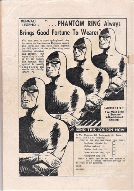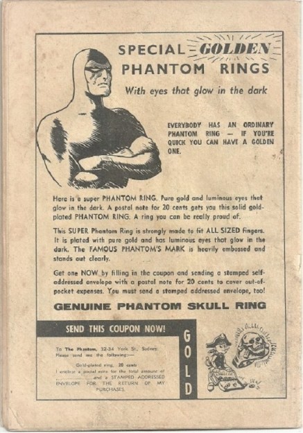 The earliest Frew Publications advertisement we see in a Phantom comic is on the back cover of number 18, published in 1950 for a Phantom Ring, requiring the reader to return a coupon, with payment, to Frew Publications.