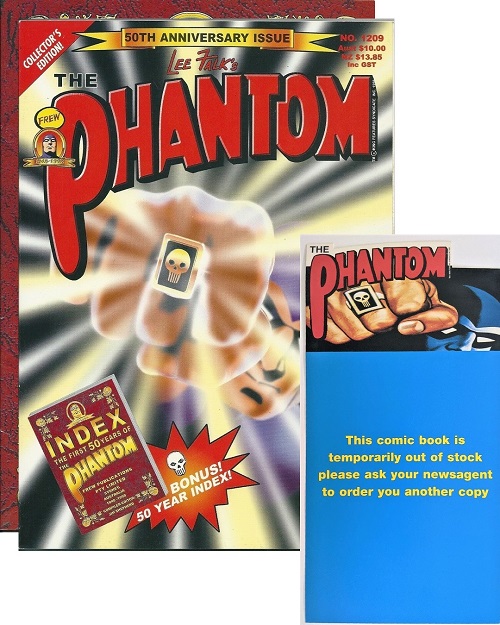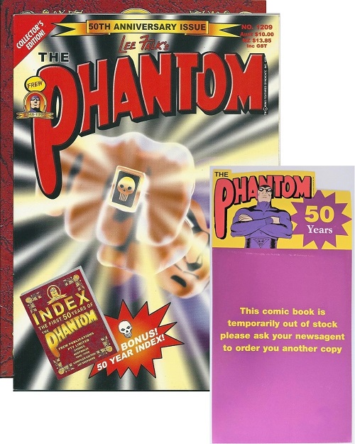 The 1998 blue promotional store display bin divider advertising Phantom comic book number 1209 measures 13.75” x 7”, printed on heavy cardboard stock. This issue has a total of 6 Phantom stories inside by Wilson McCoy and Lee Falk.