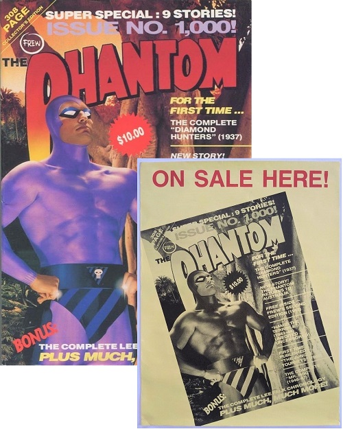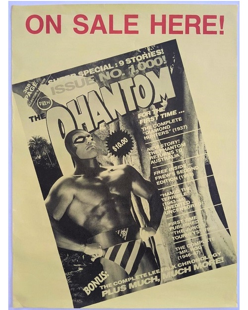 The 1992 promotional poster advertising Phantom comic book number 1000 measures 22.5” x 17”. This issue included 9 stories by Lee falk, Wilson McCoy, Sy Barry, Scott Goodall and Cesar Spadari & Jim Shepherd and Keith Chatto.