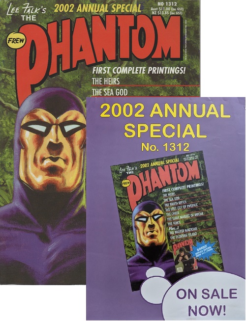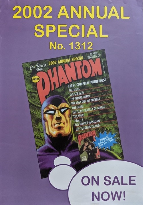 The 2002 promotional poster advertising Phantom comic book number 1312 measures 16.5” x 11.60”. This issue has a total of 9 Phantom stories with a bonus replica comic book number 11 also included by Frew Publications.