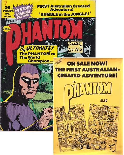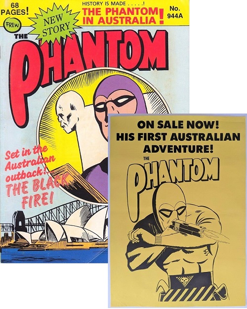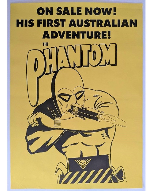 The 1990 promotional poster advertising Phantom comic book number 951A measures 18.25” x 15.5”. This issue is the ‘The First Australian CREATED Adventure’ illustrated by Australian Keith Chatto and written by Frew Publication publisher Jim Shepherd. The storyline is not set in Australia, but Bengalla.