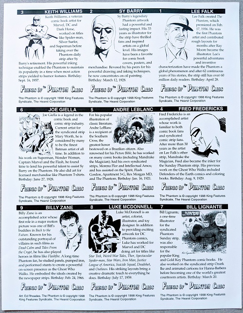 The Friends of the Phantom Cards were provided uncut on trading card style paper finished in a semi-gloss print measuring 21.7cm x 28cm. Color is found on the front with black and white print on the back, made up of 9 separate cards if cut. A small biography is found on the back of the cards, linked to the image on the front.