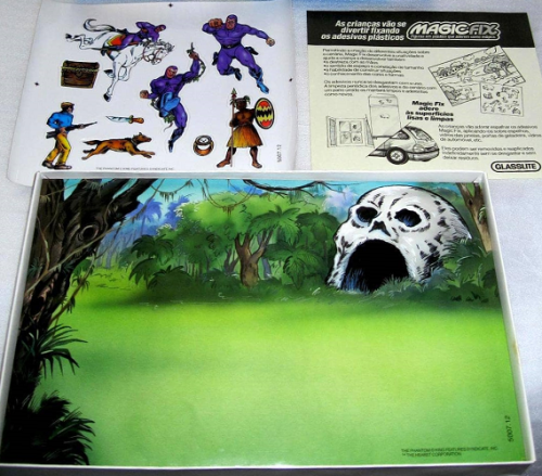 The Fantasma Playset was produced by Glasslite S.A. Indústria de Plásticos LTDA in Sao Paulo, Brazil in 1996. The Playset falls under Gasslite’s ‘Magic Fix’ set of products, with sticker style vinyl figures found within the box which can be placed on smooth surfaces, then removed and reapplied as many times as you wish. The Playset is licensed by King Features Syndicate.