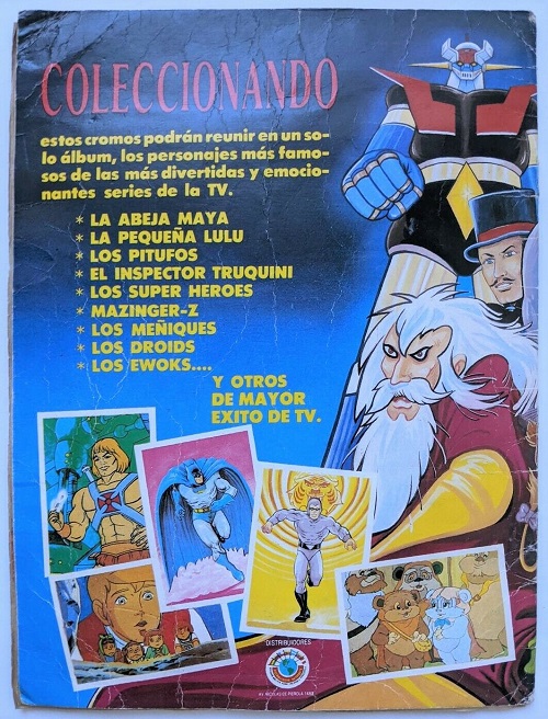Full pages are dedicated to cartoon TV shows, including, Marvel Superheroes, Star Wars Droids, He-Man, Little Lulu, Smurfs, Inspector Gadget, Mazinger-Z, Ewoks and more. The Phantom is found on the Defenders of the Earth page.