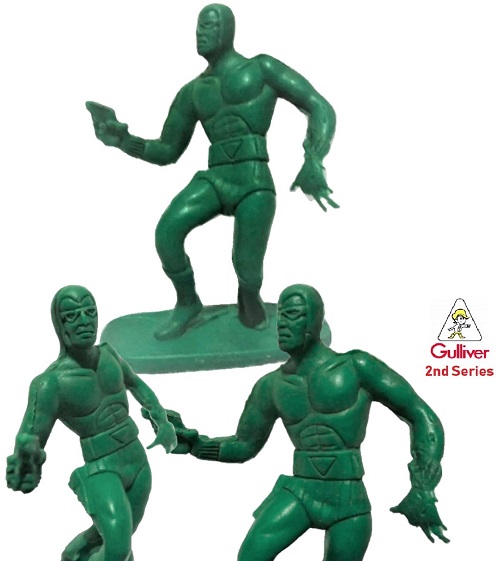 The 2nd series of Gulliver ‘Super Herois’ were released in 1978. These were made of a more malleable plastic/vinyl, hand painted which all came affixed/non detachable bases. The word Gulliver was embossed in heavy relief, not on the underside of the base, but the rear side. As these figures were hand painted, there were often color variations from figure to figure; as well as varying detail to each painted figure.