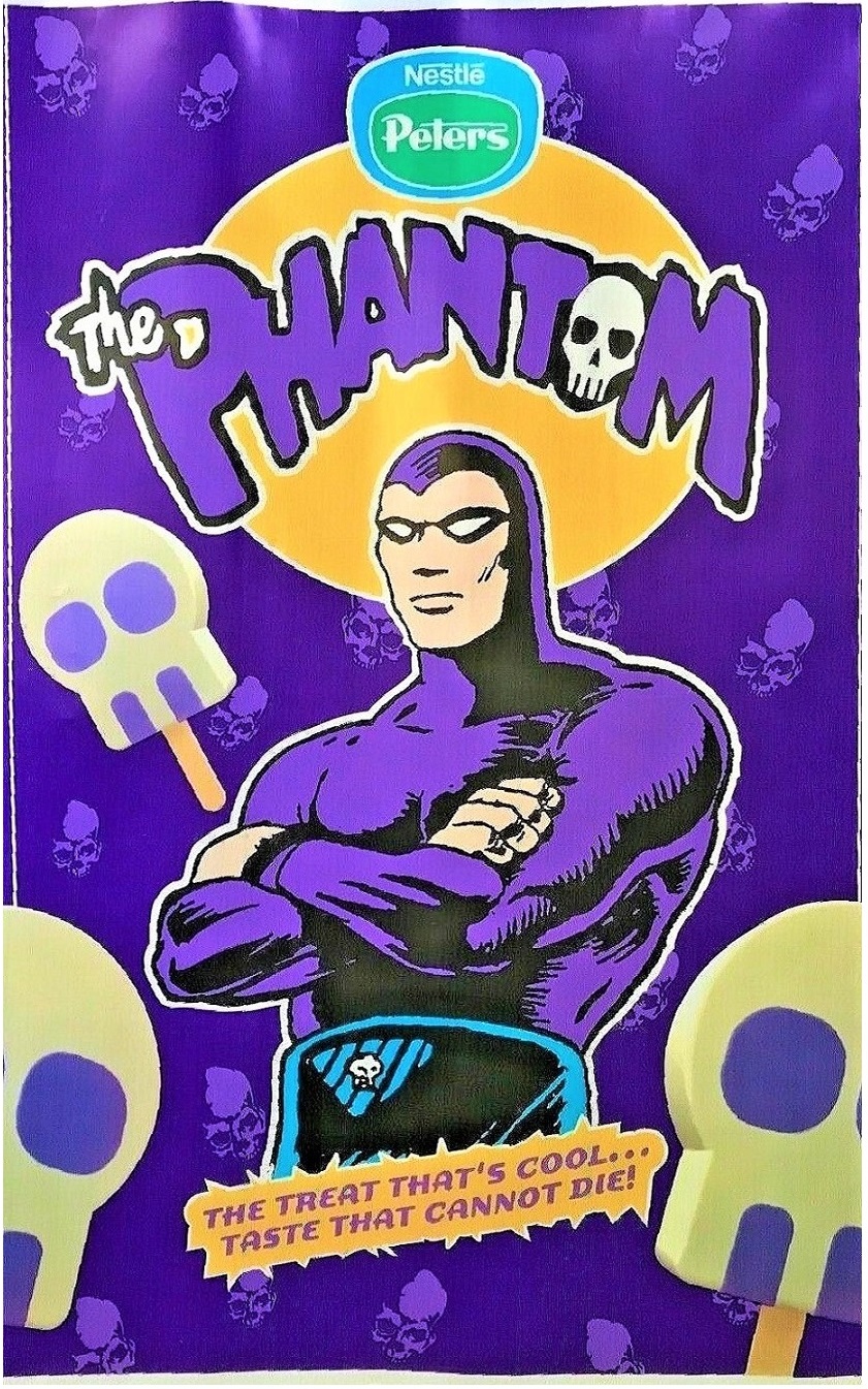 In conjunction with the 1996 Paramount Films Phantom movie release in Australia, Nestle Peters produced an ice-cream in the same year, selling for $1. The flavor is described as a ‘A Caramel Ice Cream Skull With Piercing Purple Eyes & Choc Back’.